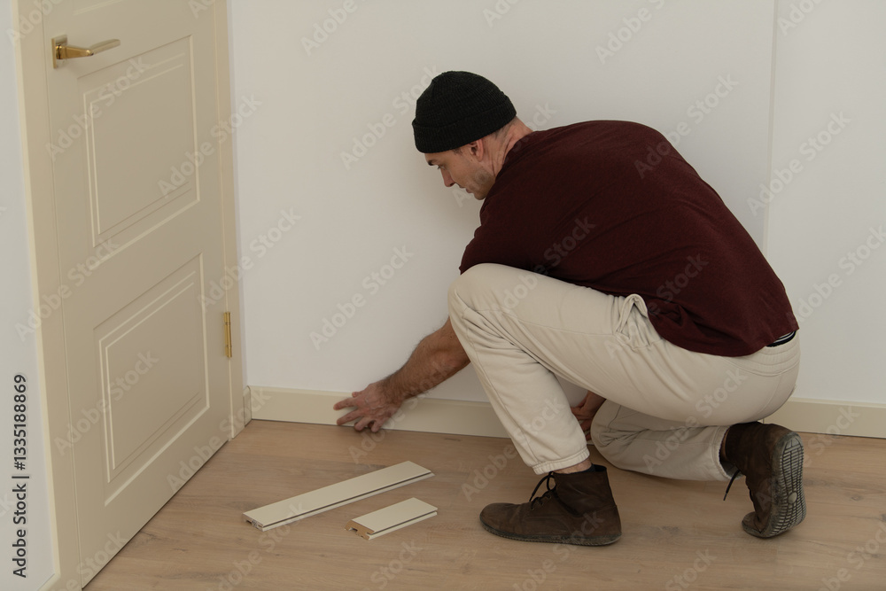 A skilled worker kneels on the floor, carefully fitting baseboards against a white wall in a freshly updated interior. Tools and materials are nearby, showcasing a focused renovation effort