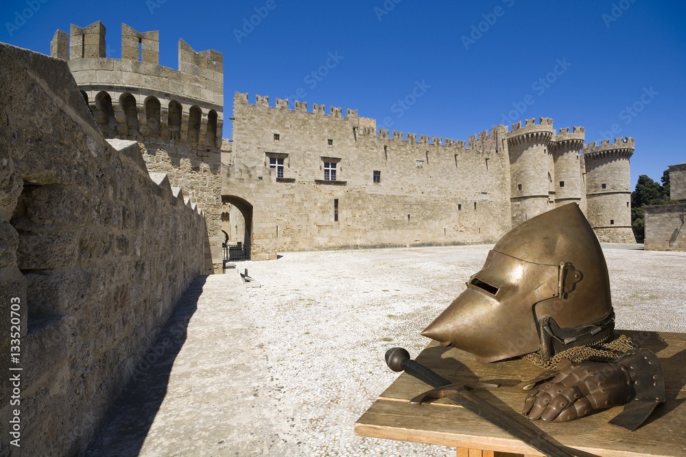 Medieval knight's armor with Palace of the Grand Master of the Order of the Knights of Saint John of Jerusalem, Rhodes, Greece