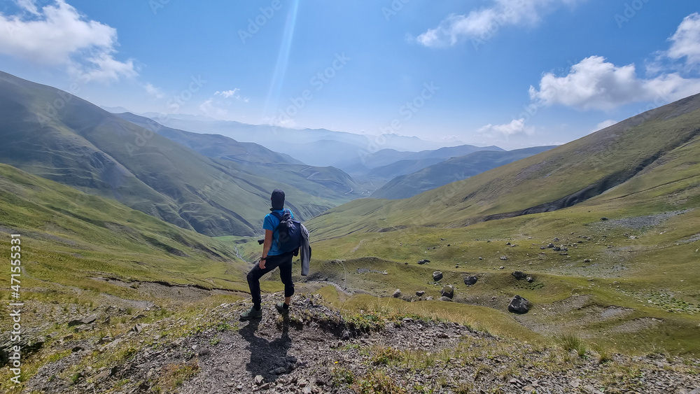 a young woman hiking next to a mountain river