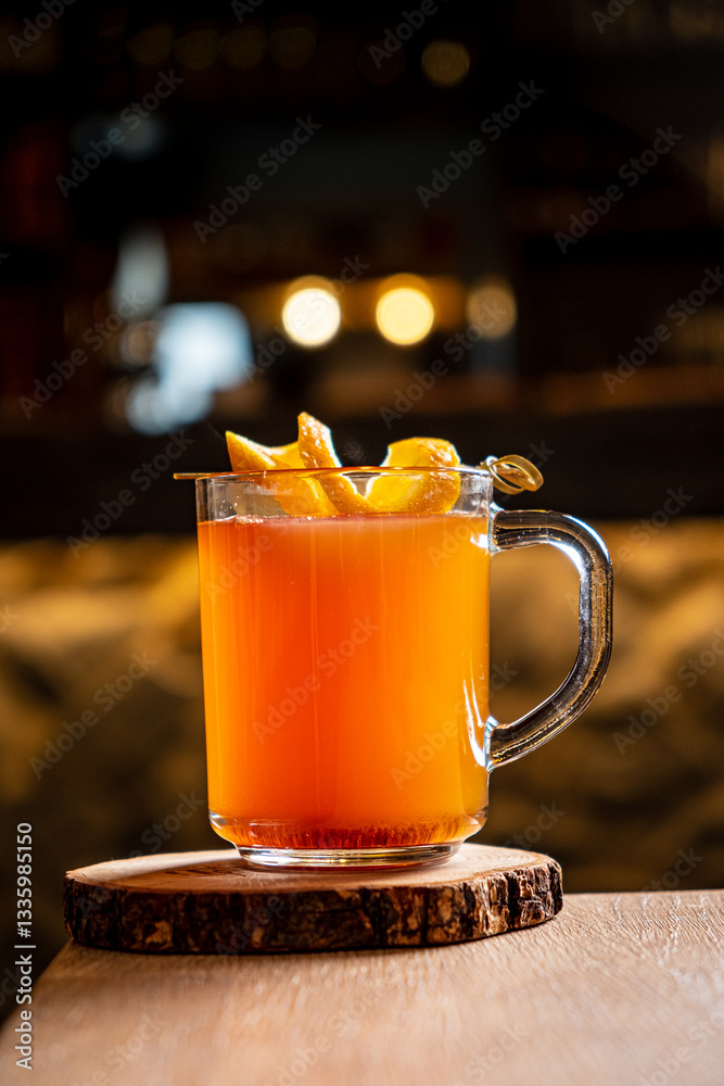 A vibrant cocktail sits on a rustic wooden coaster, adorned with fresh citrus zest, exuding warmth