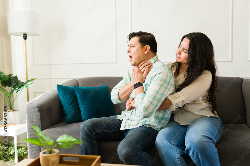 Woman performing heimlich maneuver on choking partner during urgent health crisis in home living space