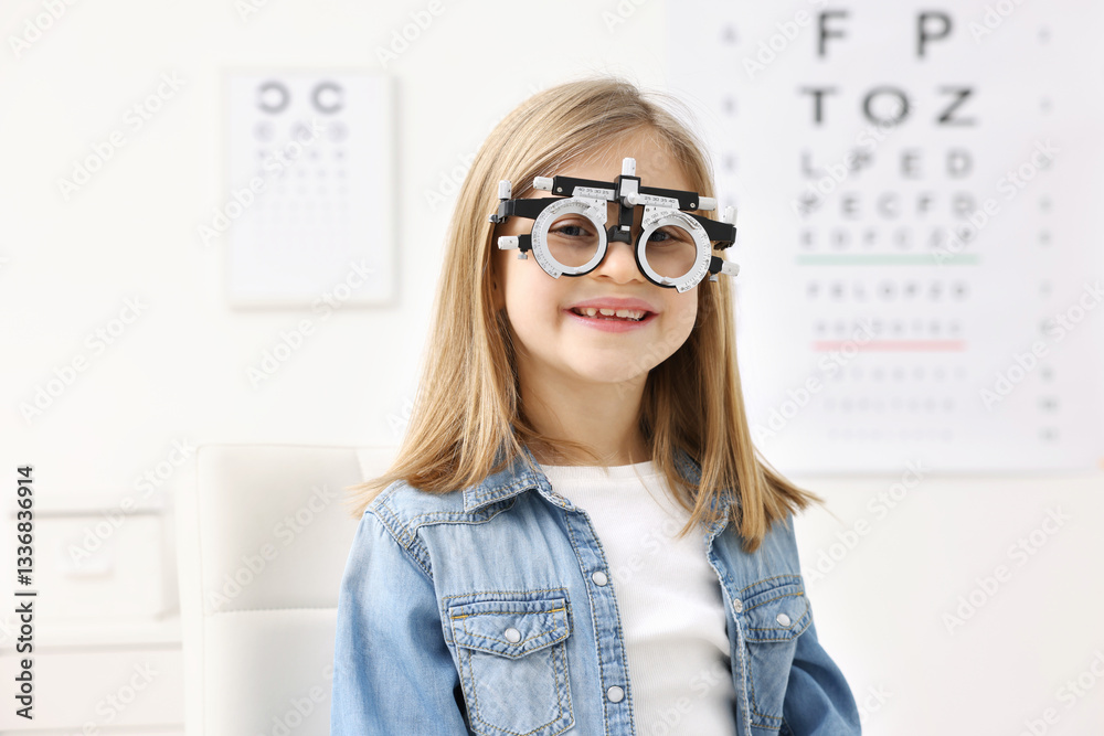 Vision testing. Little girl with trial frame at ophthalmologist office