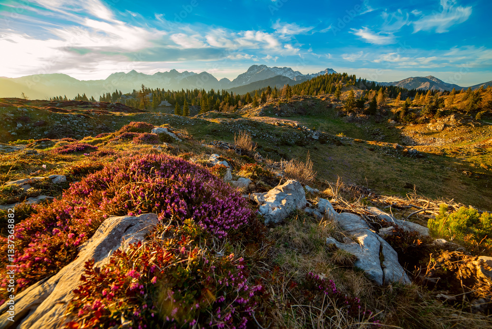 Heather flowers blooming at sunset, Velika Planina, Kamnic, Slovenia, Easter sunny landscape