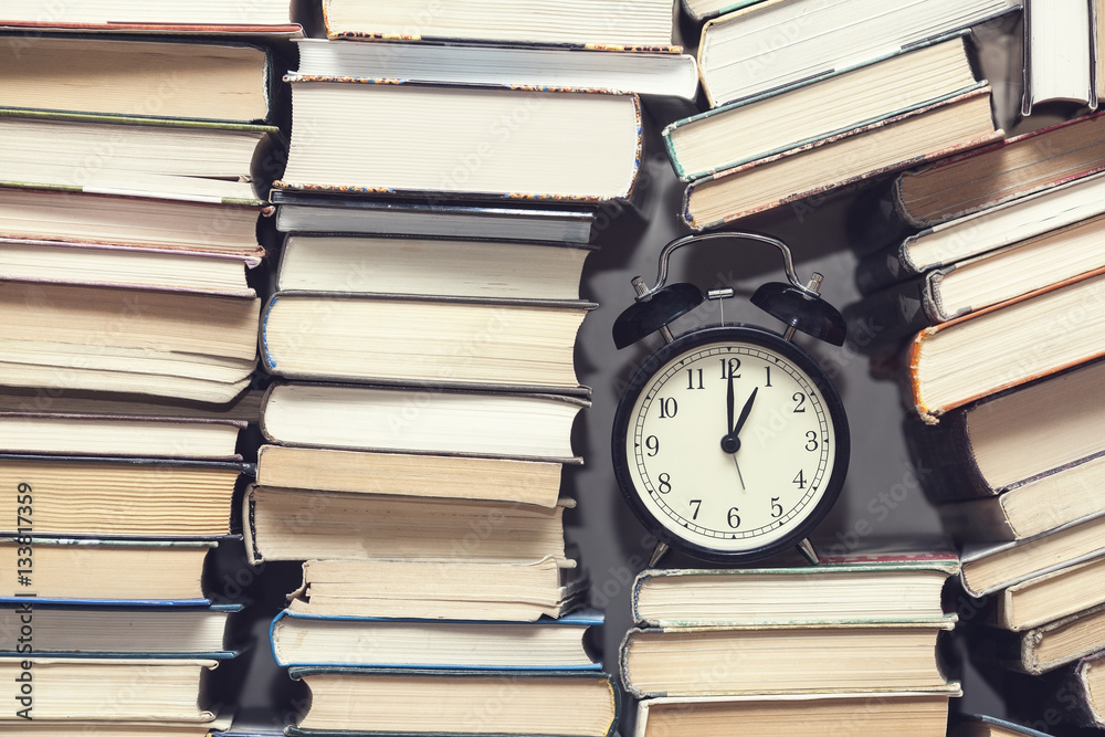 alarm clock showing one o'clock among stack of old books background, selective focus, filter applied