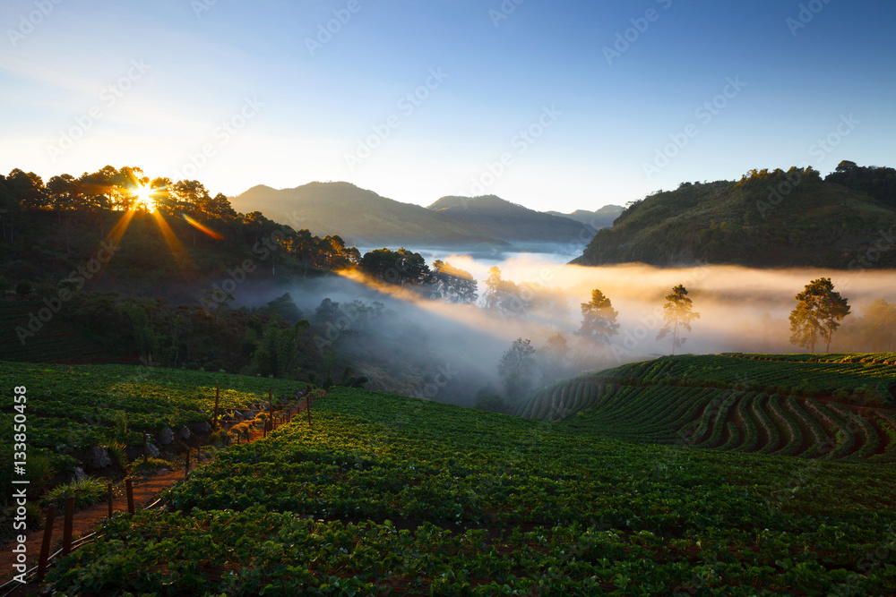 misty morning sunrise in strawberry garden at Doi Ang khang moun
