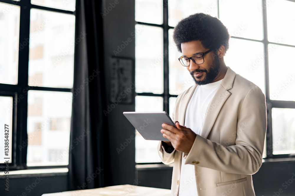 A Brazilian businessman is engrossed in his tablet, standing by a window in a modern loft office, portraying the concept of global connectivity and digital business