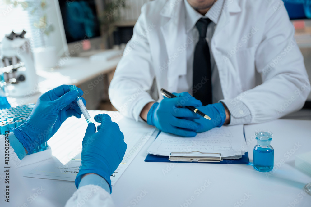 Two scientists wearing lab coats and gloves examining test tube with blue liquid in laboratory, discussing research results