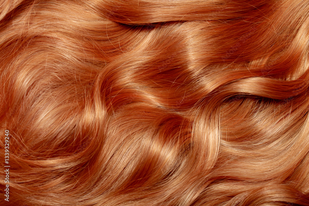 Red hair close-up as a background. Women's long orange hair. Beautifully styled wavy shiny curls. Hair coloring bright shades. Hairdressing procedures, extension.