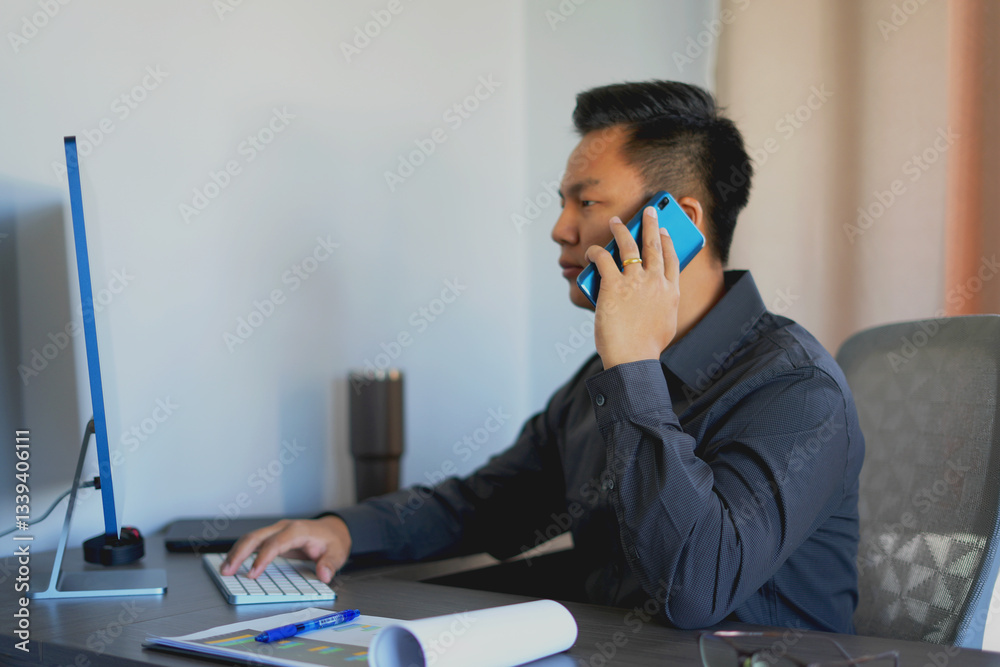 Busy young asian business man sales manager making phone call using laptop in office and talking on cellphone working consulting client discussing online digital financial data before the appointment.