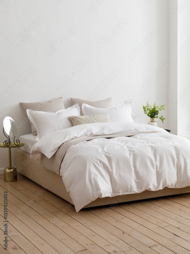 Bed in a modern bedroom with a fluffy down comforter with a duvet cover, four pillows, one beige cushion and two bedside tables with mirror and posy. Side view vertical photo. Suitable for mockup