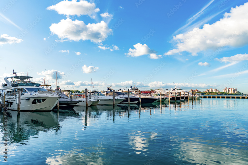 Luxury yacht marina. Docked luxurious yacht boat. Luxury lifestyle. Motorboat at sea. Summer vacation. Marina bay. Motorboat yacht sailing at sea. Yachting boat tourism. Motorboat sea marina