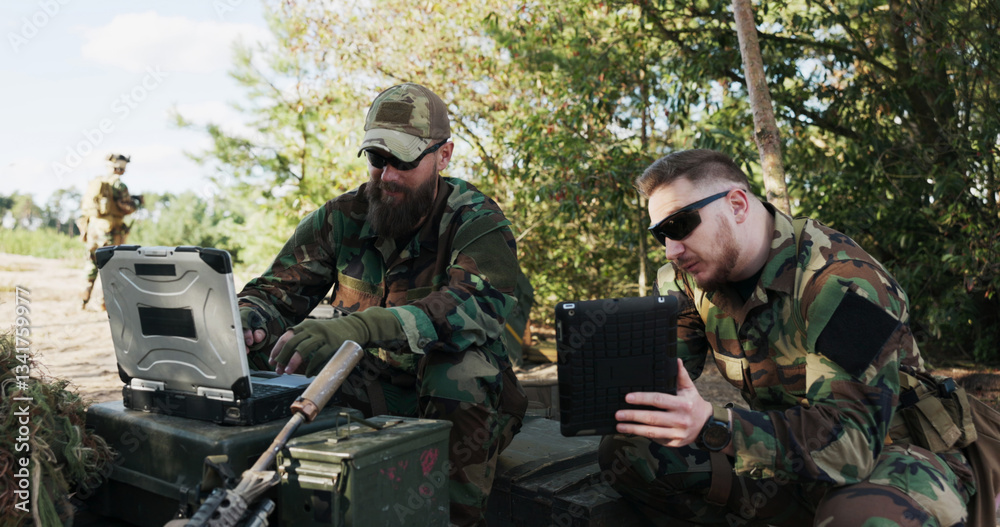 Army soldiers dressed in camouflage uniforms and helmets stand at the training ground, holding a tablet, entering data, and discussing tactics to execute a surprise attack on the enemy.