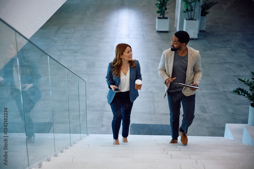 Happy colleagues talking while moving upstairs in office.