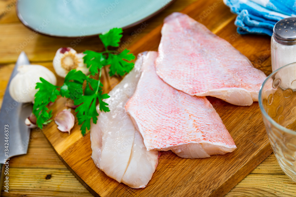 Fresh raw fillet of rockfish on wooden cutting board with aromatic herbs and garlic