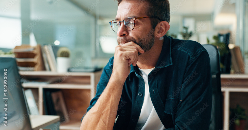 Journalist, laptop and reading in office with night, overtime and writer at publishing agency. Creative proposal, professional man and deadline for news article, reporter and employee in workplace