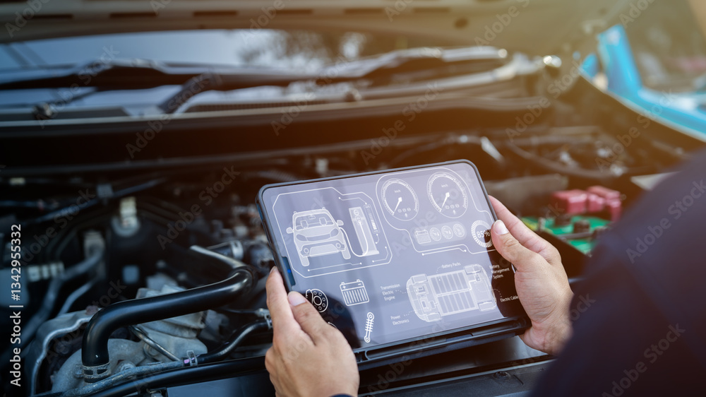 Auto mechanics use tablet computers with cutting-edge interactive diagnostic software to find faulty parts in the engine compartment.