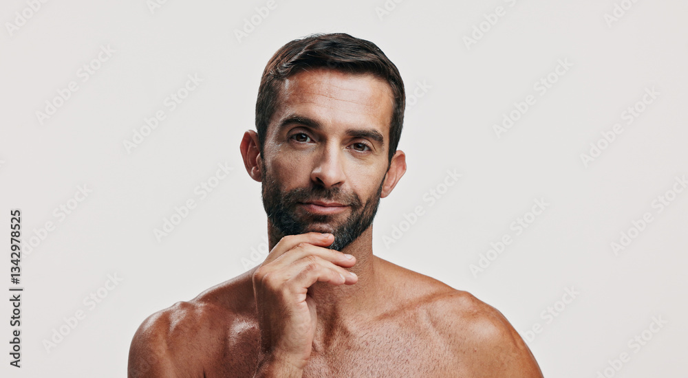 Confident, beauty or portrait of man in studio for skincare glow, grooming mockup and dermatology. Self care cosmetics, male model and person on white background for facial treatment, space or shine
