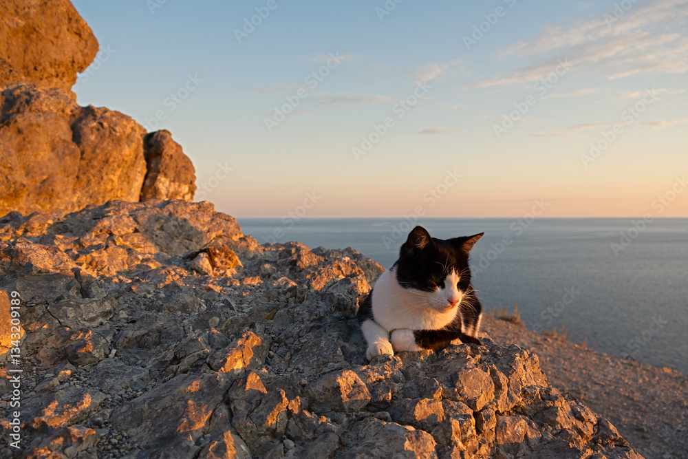 Black white cat portrait close-up. A beautiful cat is sitting in the park and looking away. A beautiful street serious cat. Cute fluffy posing for the camera on a warm spring day. Blurred background