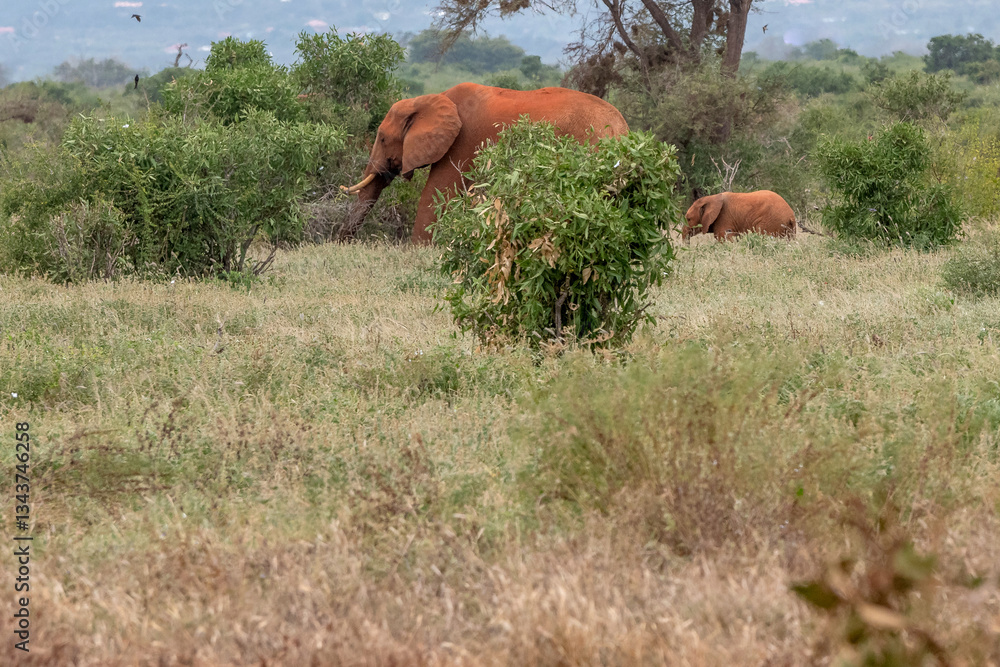 Słonica z młodym słoniem spacerują na sawannie w Kenii