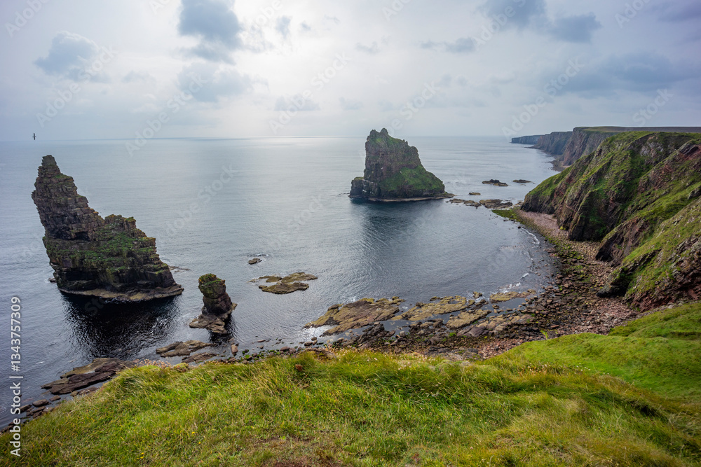 Duncansby Stacks, a breathtaking coastal wonder in Scotland, rise dramatically from the North Sea. Standing atop the towering cliffs, visitors are rewarded with panoramic ocean views, rugged landscape