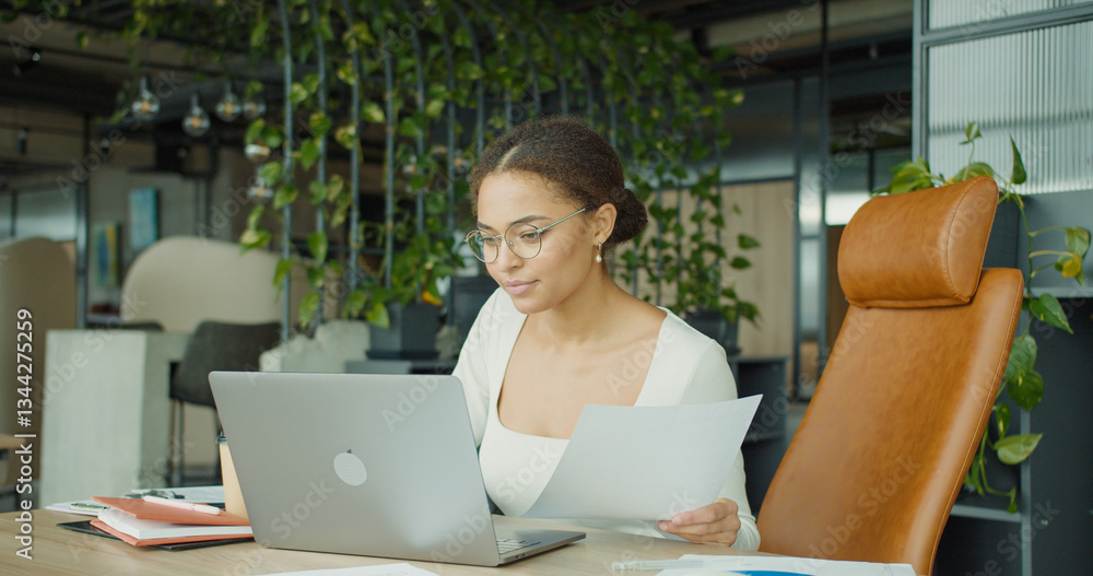 A focused professional woman analyzing documents and working on a laptop in a modern, green office space with stylish furniture, productivity tools, and natural light