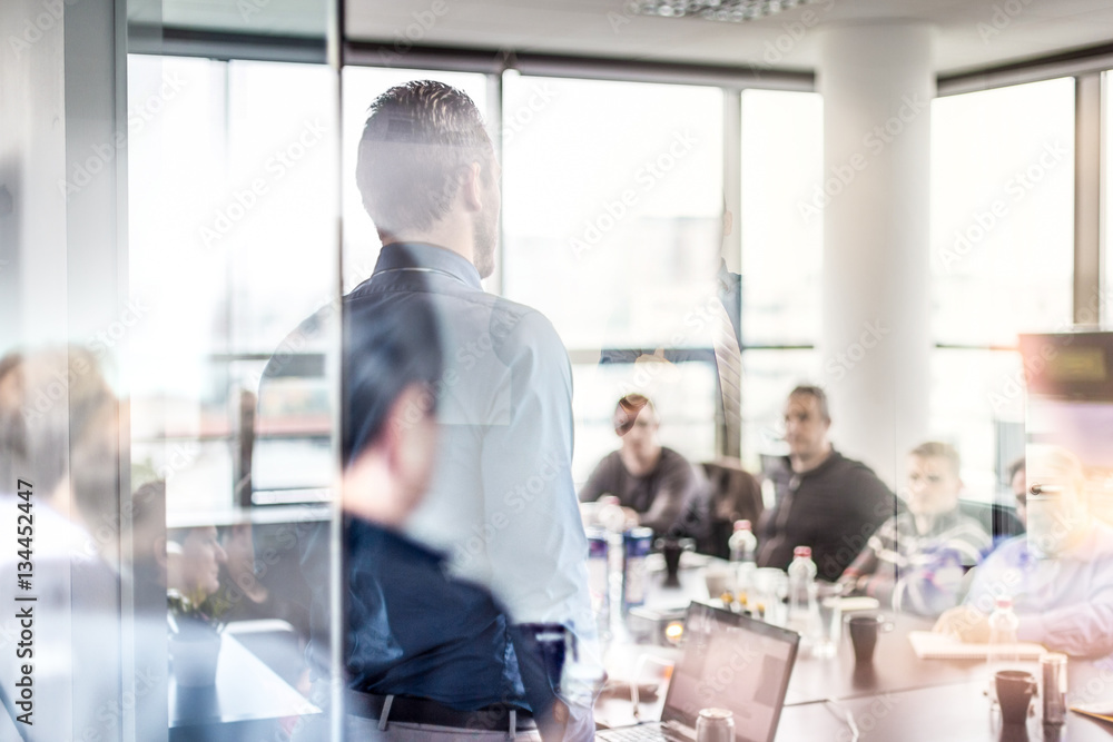 Business man making a presentation at office. Business executive delivering a presentation to his colleagues during meeting or in-house workshop. Rear view. Business and entrepreneurship.