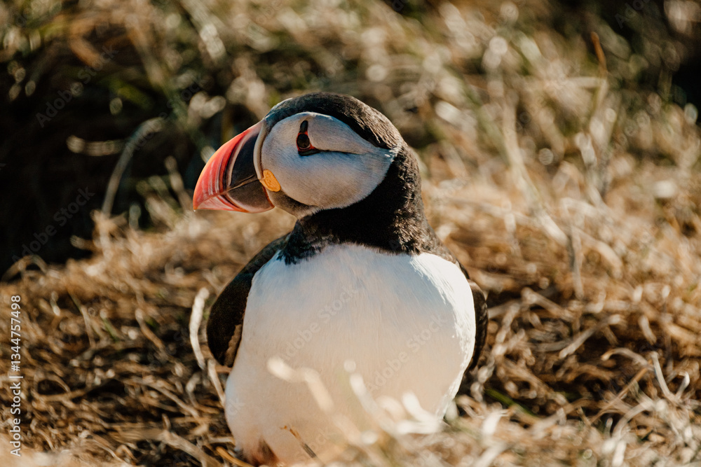 Close-up of an Atlantic puffin in golden sunlight, Borgafjordur Eystri, Iceland...