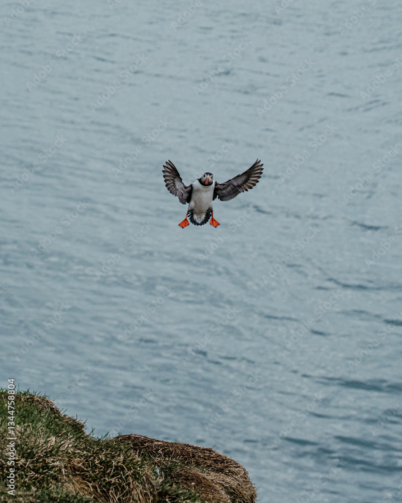 Atlantic puffin in flight over grassy cliffs in Borgafjordur Eystri, Iceland...