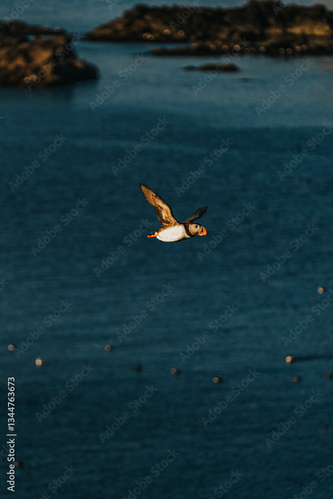Atlantic puffin in mid-flight over the ocean at Borgarfjörður Eystri, East Iceland