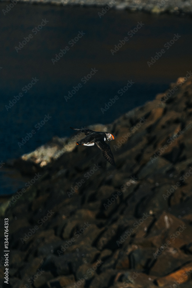 Atlantic puffin flying over the harbor in Borgarfjörður Eystri, East Iceland