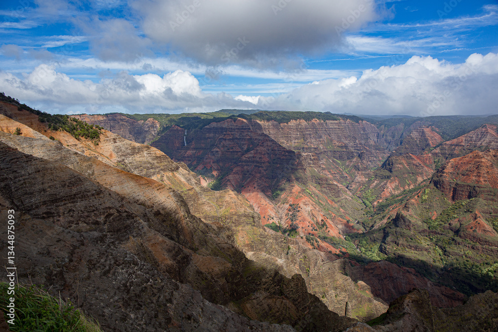 Majestic View of Waimea Canyon on sunny day, with clouds on sky