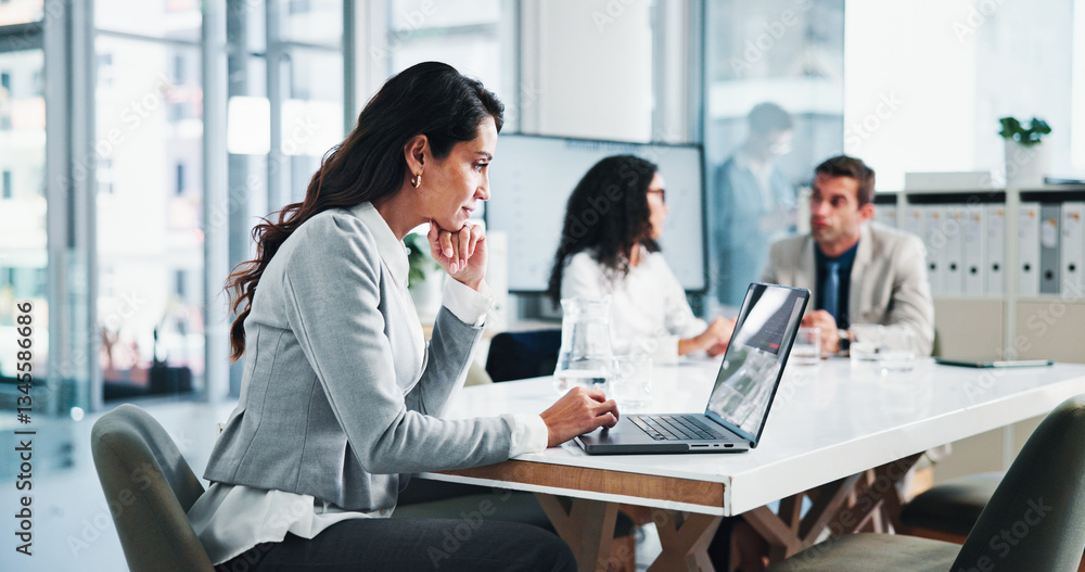 Meeting, accounting research or businesswoman on laptop with shareholders for planning or capital growth. Manager, finance budget or financial advisors in boardroom office with executive directors