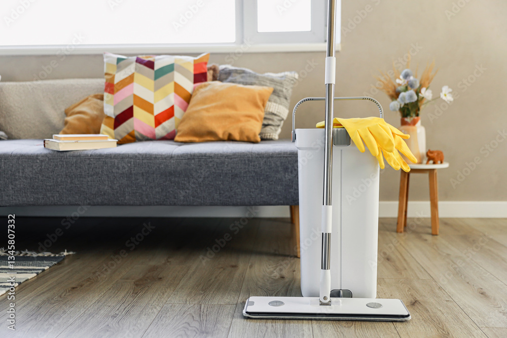 Cleaning supplies: mop, gloves, bucket with wringer sitting on wooden laminate floor in modern living room, wet equipment tools, housekeeping concept. Emphasizing home sanitation, cleanliness, hygiene