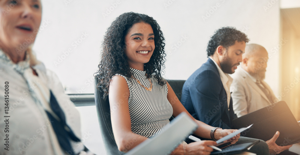 Business, woman and audience in seminar, group and colleagues in workshop for training or meeting. Conference, information and coworkers with notes for presentation, portrait and people in boardroom