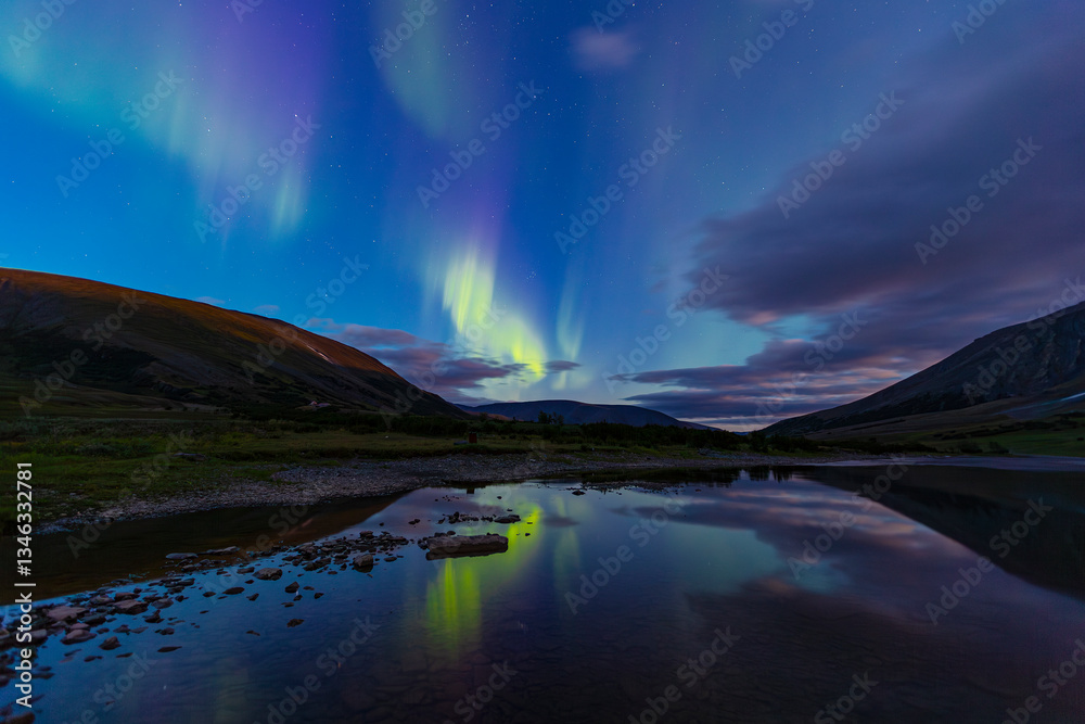 Aurora in the night sky cut the mountains, reflected in the water. Yamal. Russia