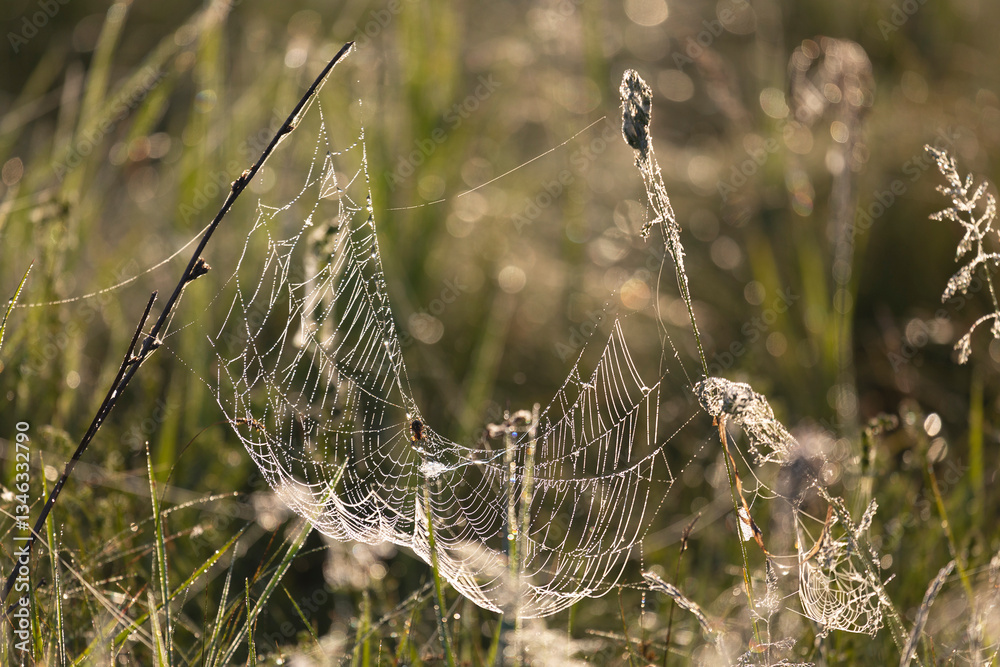 Large web with a spider on a blade of grass in the morning in the fog close up