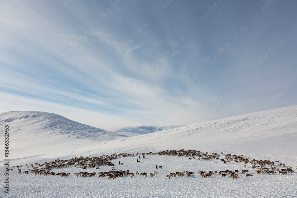 large herd of reindeers in winter, Yamal, Russia