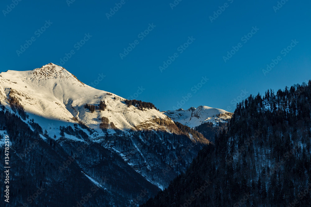 Snowy Mountain tops in the blue sky sun