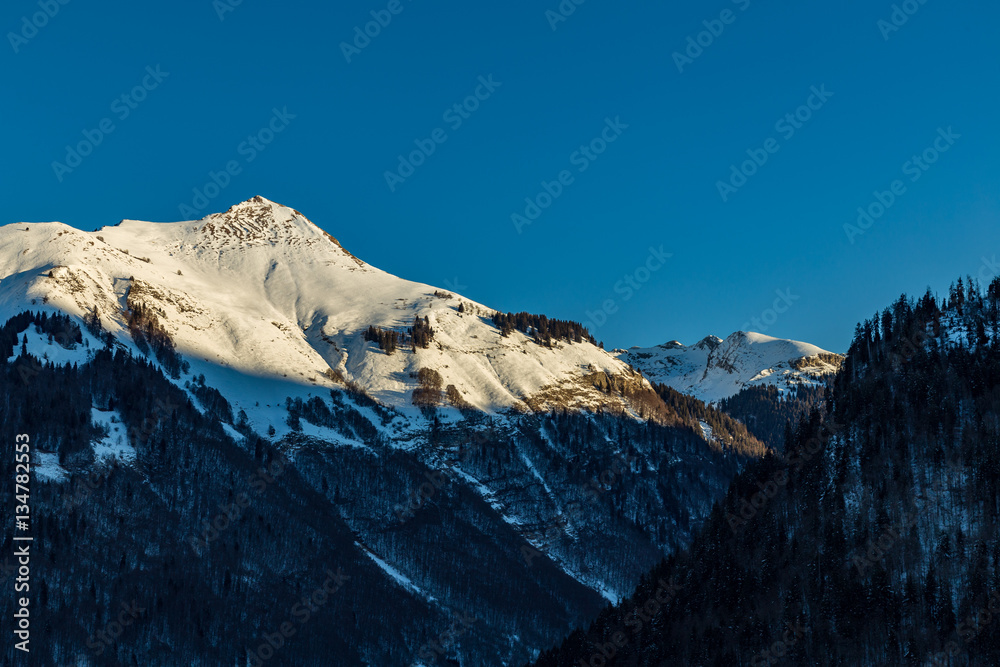 Snowy Mountain tops in the blue sky sun