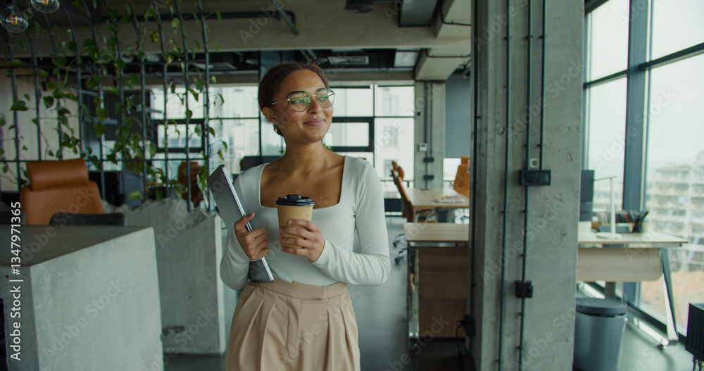 young professional woman with glasses and coffee cup walking confidently in a modern office, holding a laptop and smiling while looking out large glass windows with natural lighting