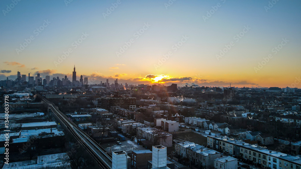 Aerial winter view of Chicago cityscape Tower, snow-dusted rooftops, and train station. The image captures the contrast between dense downtown skyscrapers and surrounding residential-industrial zones