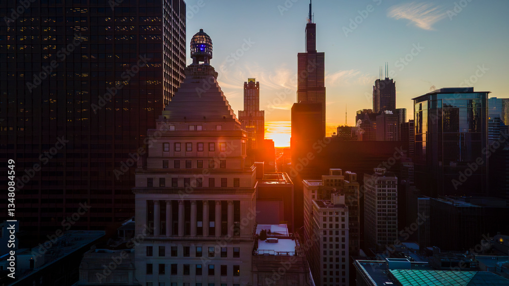 Chicago's Majestic city skyline at sunset, with golden light illuminating skyscrapers and casting dramatic shadows. A striking blend of urban architecture and natural beauty,