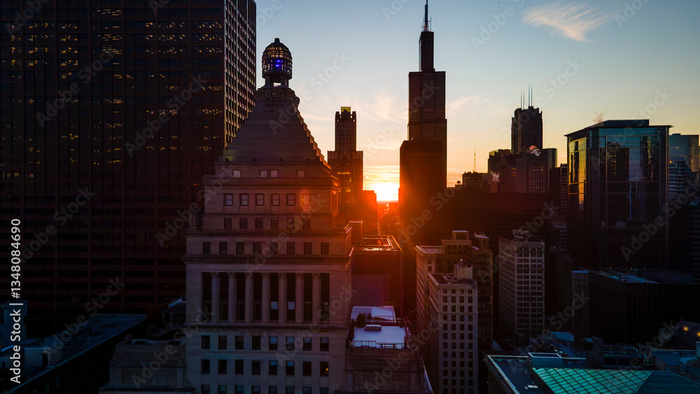Chicago's Majestic city skyline at sunset, with golden light illuminating skyscrapers and casting dramatic shadows. A striking blend of urban architecture and natural beauty,
