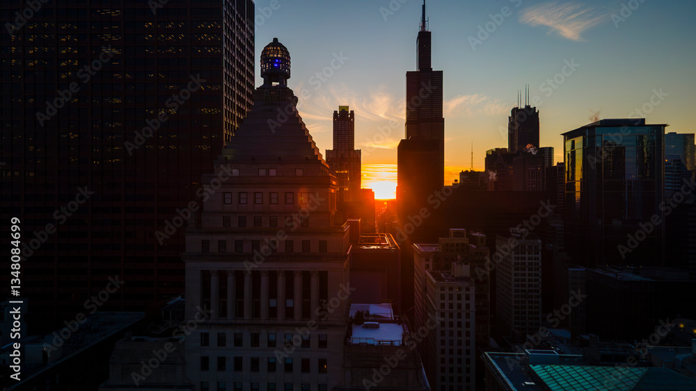 Chicago's Majestic city skyline at sunset, with golden light illuminating skyscrapers and casting dramatic shadows. A striking blend of urban architecture and natural beauty,