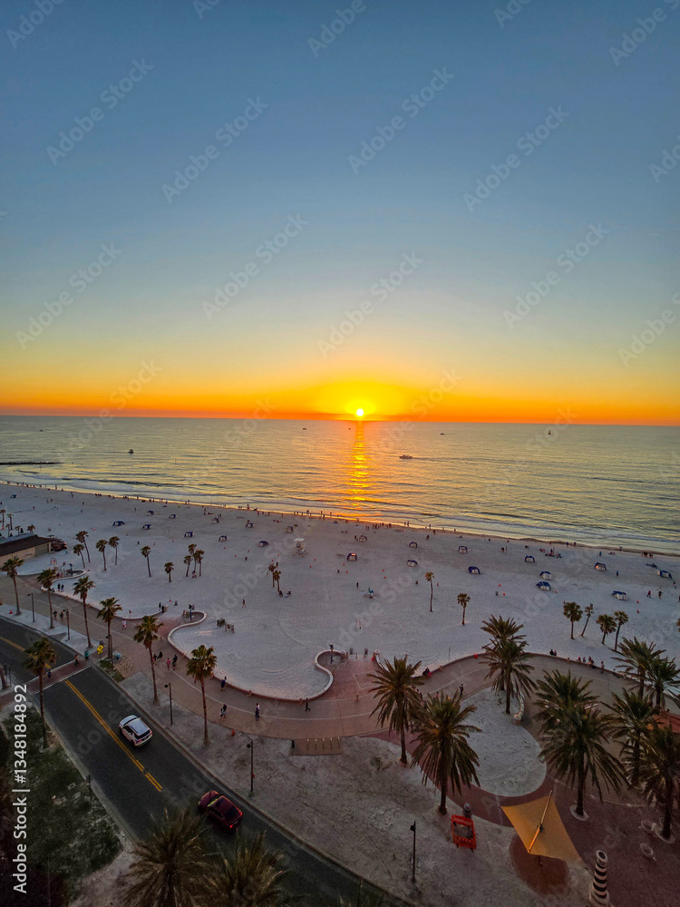 A stunning sunset over the Gulf of Mexico at Clearwater Beach with vast ocean water and people relaxing in Clearwater Florida USA
