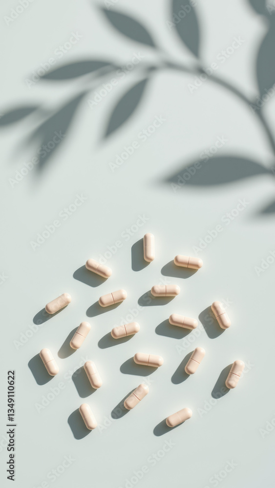 Magnesium glycinate tablets on a surface with leaves' shadows.