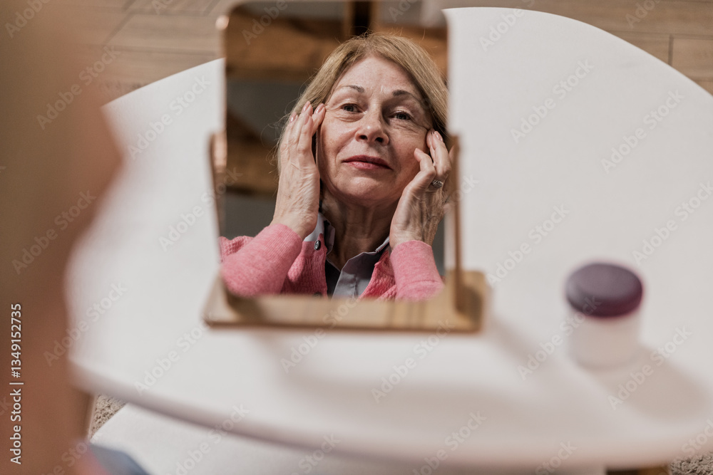 Senior woman sitting at home and spreading cream on face, massaging it. Older handsome woman skin cares using cosmetics products for hydrating. Elderly female retired doing facefitness and massage