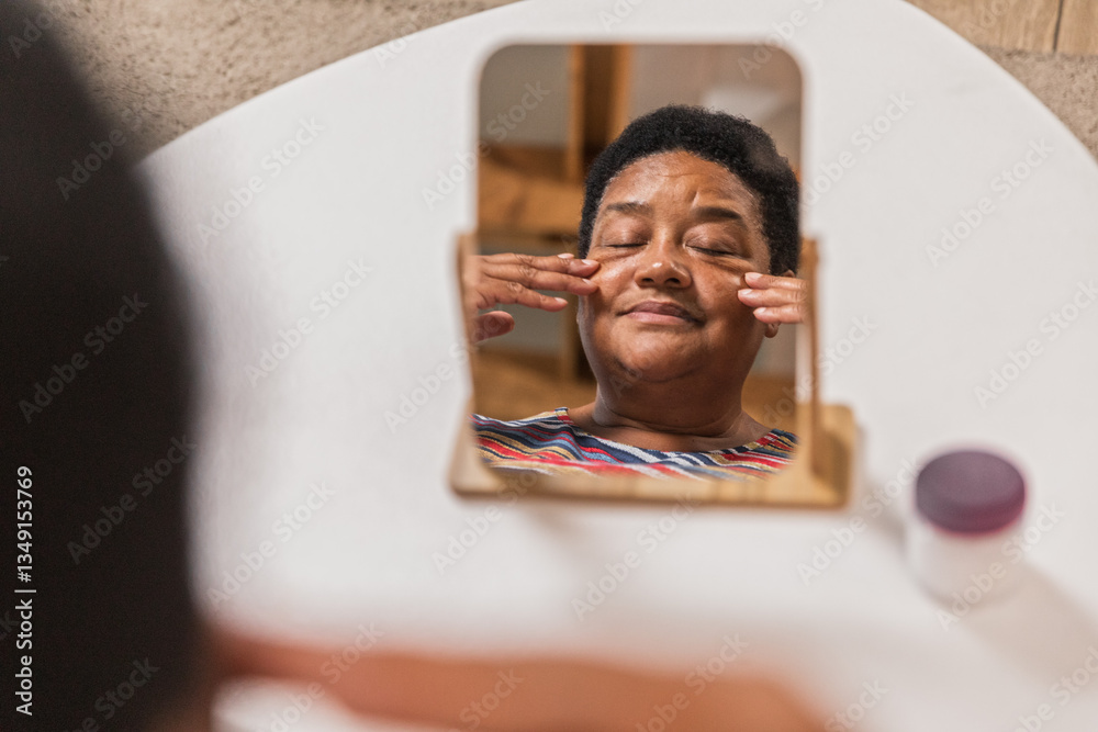 Senior afro woman sitting at home and spreading cream on face, massaging. Older woman skin cares using cosmetics products for hydrating. Elderly female retired doing facefitness looking mirror