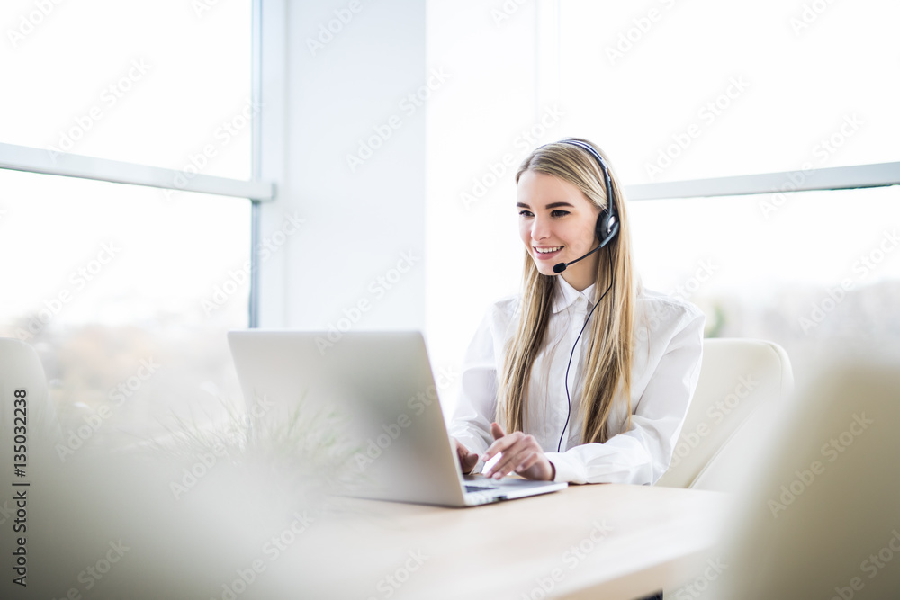 Woman customer support operator with headset and smiling