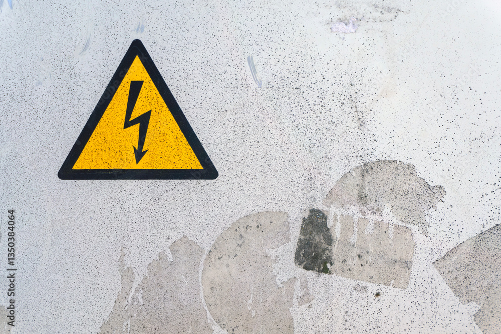 Warning sign indicating high voltage on a weathered concrete surface near an electrical installation